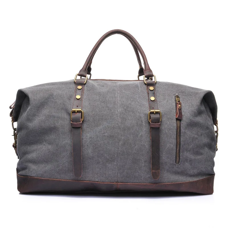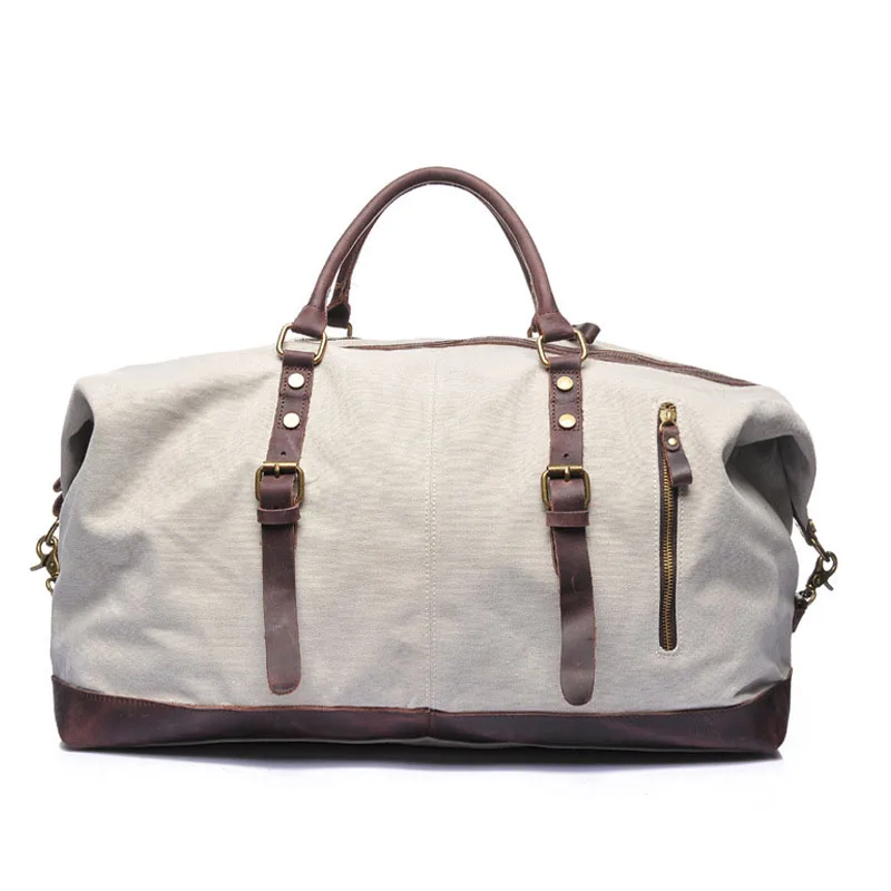 Large Capacity Handbag Men's Canvas Top Layer Cowhide Splicing Designer Duffle Bag Fashion Barrel Shaped Large Shoulder Bag